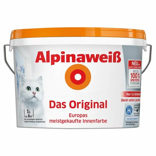 Ein neuer Anstrich tut gut! Diese weiß matte Innendispersionfarbe Alpinweiß Das Original enthält etwa 1000 ml. Sie ist hochdeckend und scheuerbeständig und somit für alle sensiblen Lebens- und Arbeitsbereiche geeignet. Mit der Spritz-Schutz-Formel können Sie bei sachgemäßer Verwendung bis zu 100% weniger Spritzen und sich das lästige Schrubben nach dem Anstrich sparen.