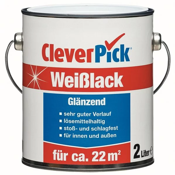 Glänzender Weißlack CleverPick für den Innen- und Außenbereich. Dieser Lack ist besonders stoß- und schlagfest. Er ist lösemittelhaltig und bietet einen sehr guten Verlauf. Dieser 2 Liter Eimer deckt eine Fläche von bis zu 22 m² ab.
