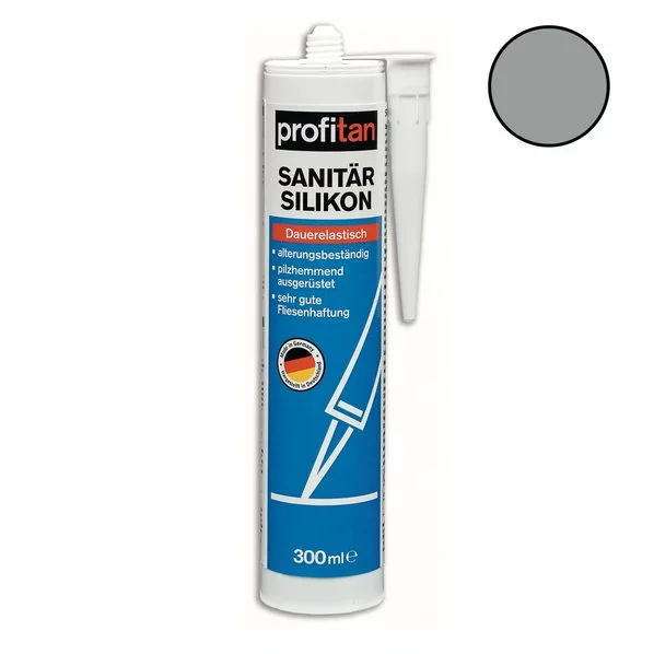 Sanitär-Silikon von profitan speziell für den Sanitär- und Feuchtraumbereich in dem Farbton Grau. Zum Verfugen von beispielsweise Randfugen zwischen Wand und Boden, Eckfugen, Feldbegrenzungsfugen und Anschlussfugen. Dieser Sanitär-Silikon von profitan ist daueralastisch und pilzhemmend ausgerüstet und hat eine sehr gute Fliesenhaftung.