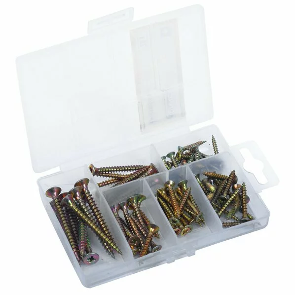 Mit diesem vielfältigen Sortimentskasten haben Sie immer die passende Schraube parat. 76 verschiedene Schrauben mit Senkkopf und PZ-Schraubenantrieb lassen vielfältige Einsatzmöglichkeiten zu.