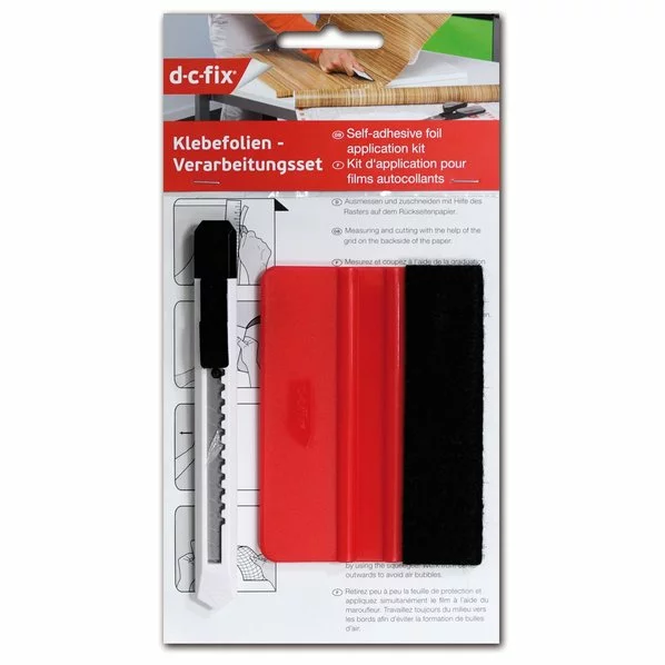 Mit diesem Verarbeitungsset bringen Sie Ihre Klebefolie im Handumdrehen an. Die beiden Utensilien ermöglichen Ihnen sicheres und unkompliziertes Verarbeiten. Schneiden Sie Ihre Klebefolie mit dem Cutter-Messer zurecht und streichen Sie diese dann mit dem Rakel fest. Das Ergebnis wird Sie begeistern!