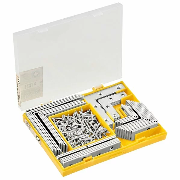 Dieses Verbindungssortiment besteht aus Möbelwinkel, Befestigungswinkel, Eck- und Flachverbinder sowie Stuhlwinkel. Die benötigten Universalschrauben sind in dem Sortiment bereits inklusive.